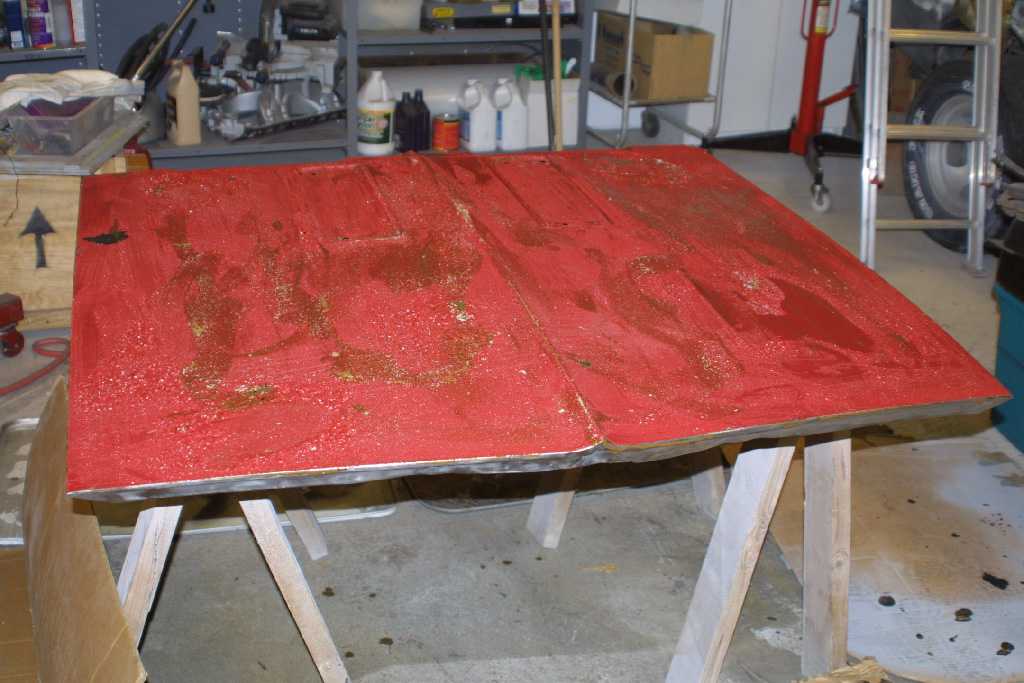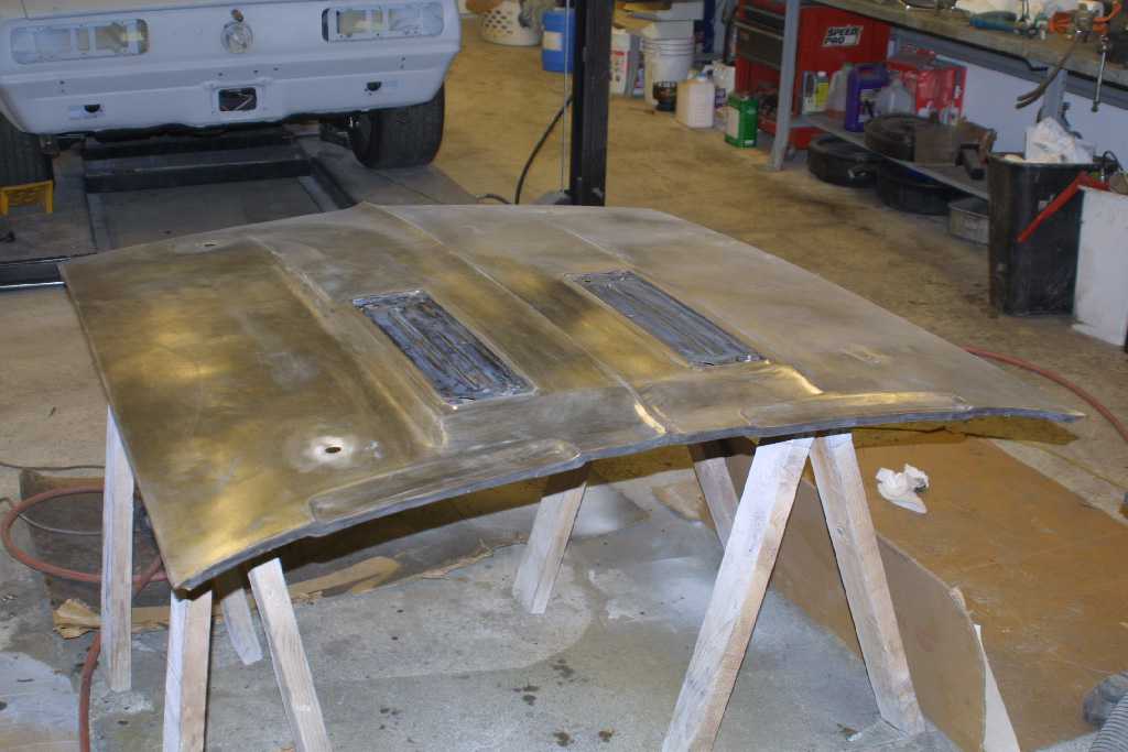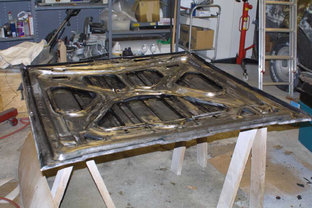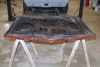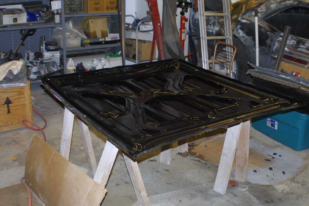 The hood was a real mess. There was rust, bondo everywhere, dents and hacked up. You have to wonder what was on the peoples mind when they got their hands on this! They even drilled holes in the back of the hood for rear hood pins!! I stripped both sides then prepped with Metal Ready and sprayed with POR-15. The finished picture shows the paint still wet, when it dries it will be a semi-gloss look.